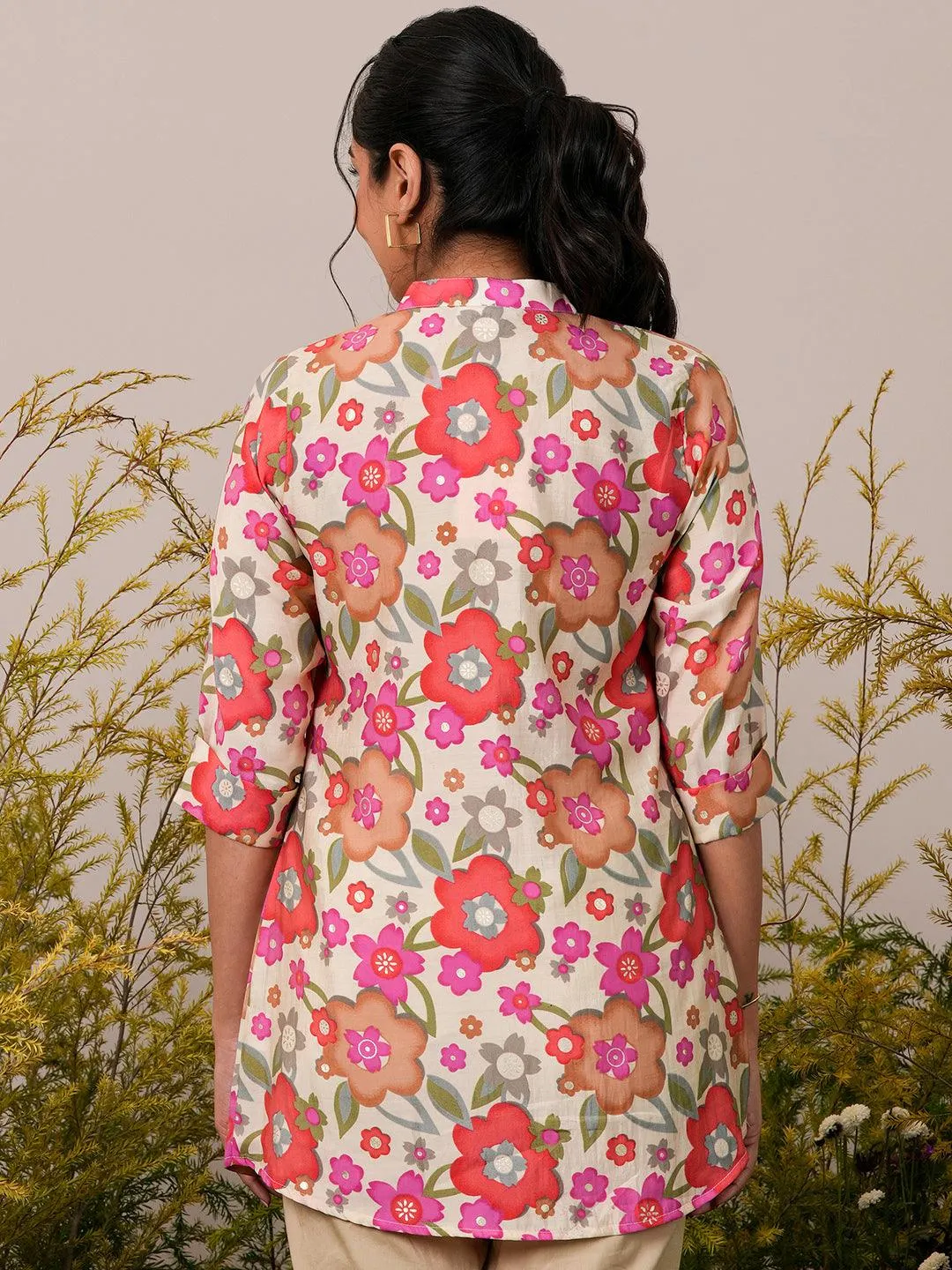 Cream Printed Silk Blend A-Line Kurti