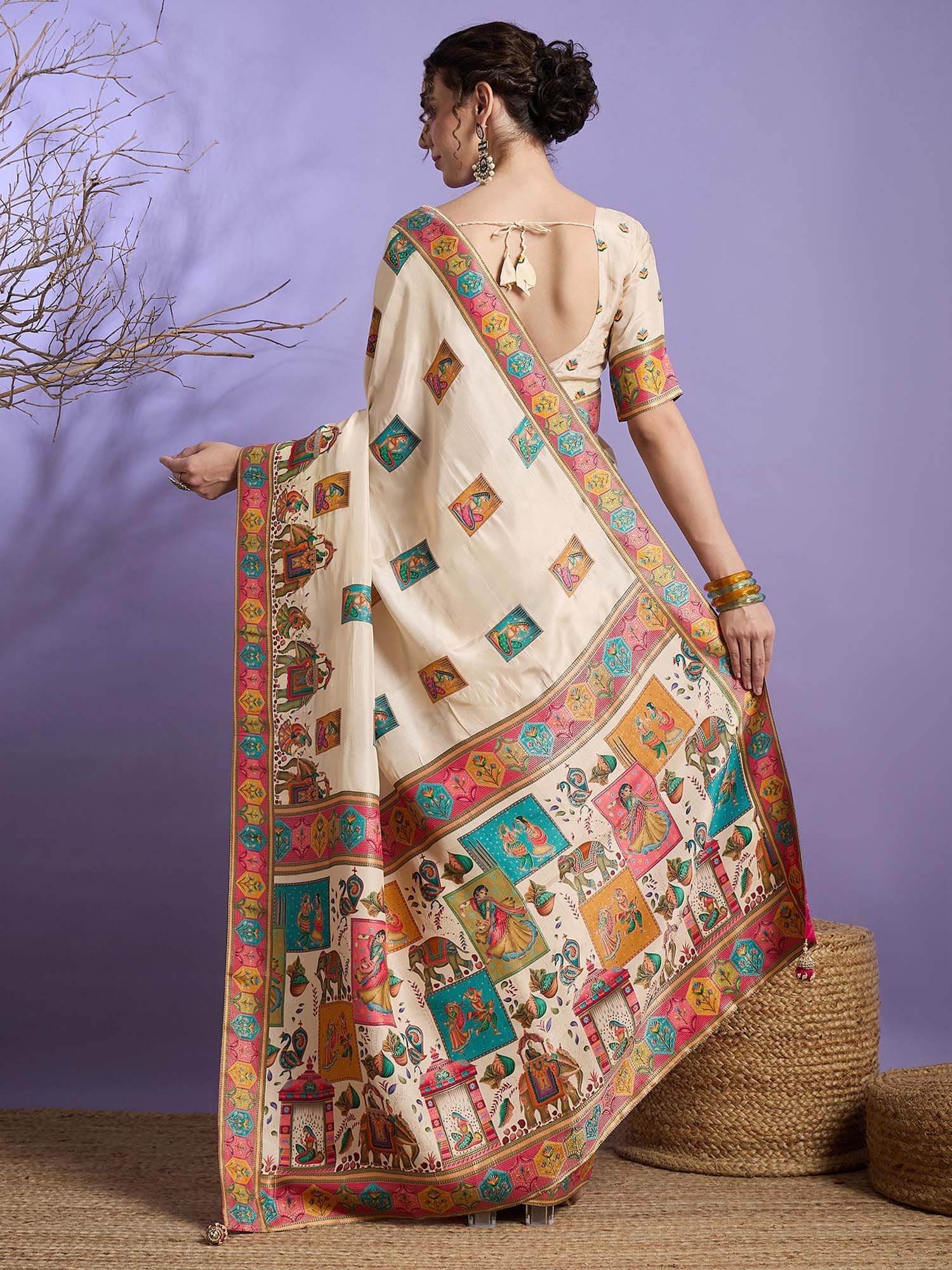Cream Woven Viscose Saree with Unstitched Blouse