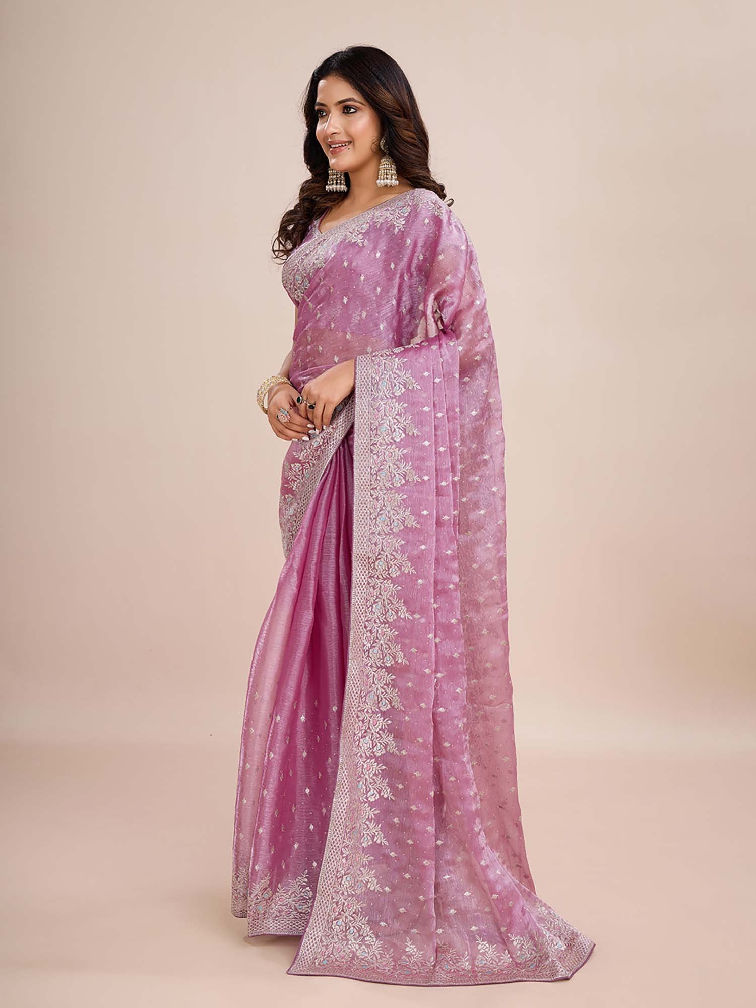 Lavender Embroidered Pre-Drapped Saree with Unstitched Blouse