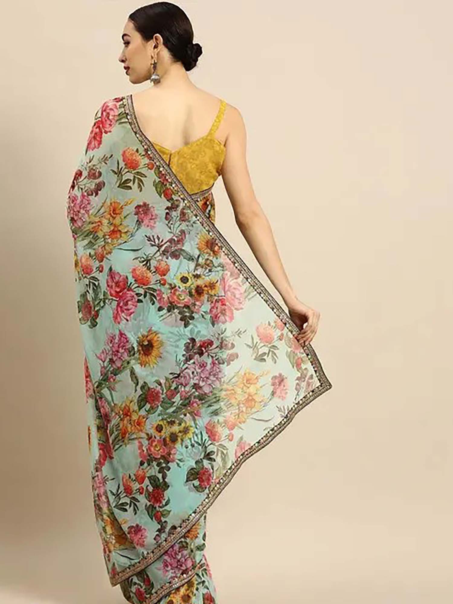 Sea Green Indie Floral Saree with Unstitched Blouse